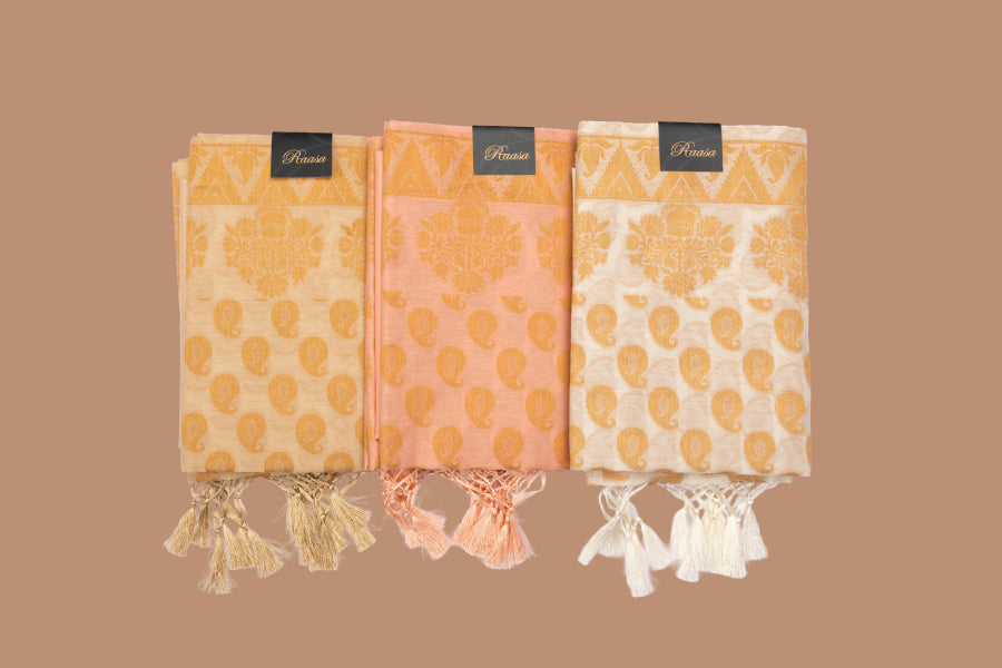 This Chanderi Woven Suit with Chanderi Woven duppatta & plain bottom is a versatile 3-piece suit set, featuring shades of Beige, Peach, Offwhite. Ideal for both casual gatherings and special occasions, it combines comfort with traditional elegance.