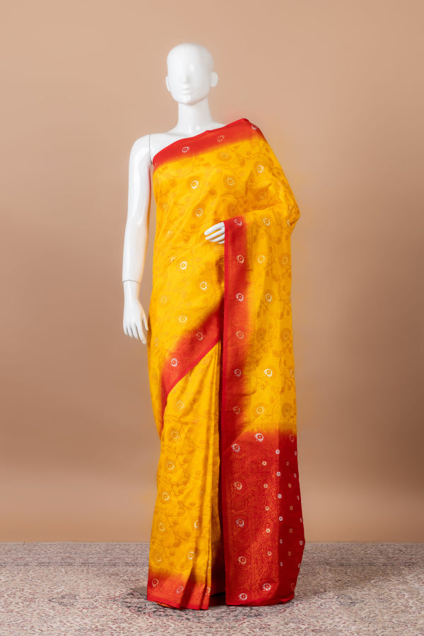 A timeless Banarasi Chanderi Silk Saree, crafted with care and elegance. Presented in rich tones of Yellow/Red, Green/Blue, Blue/Red, Orange/Yellow, this saree is designed for festive celebrations, weddings, and graceful evening wear. Best maintained with Dry Clean Only.
